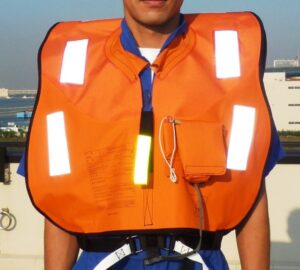 着水と同時に自動で膨らむ、安心の自動膨脹式救命胴衣 自動膨脹機能により、万が一の落水時も確実に浮力を確保します。 さらにコンパクトで軽量な設計で、丈夫なポリウレタンコーティング生地を使用しており、折りたたんで小さなスペースにも効率よく収納可能です。
